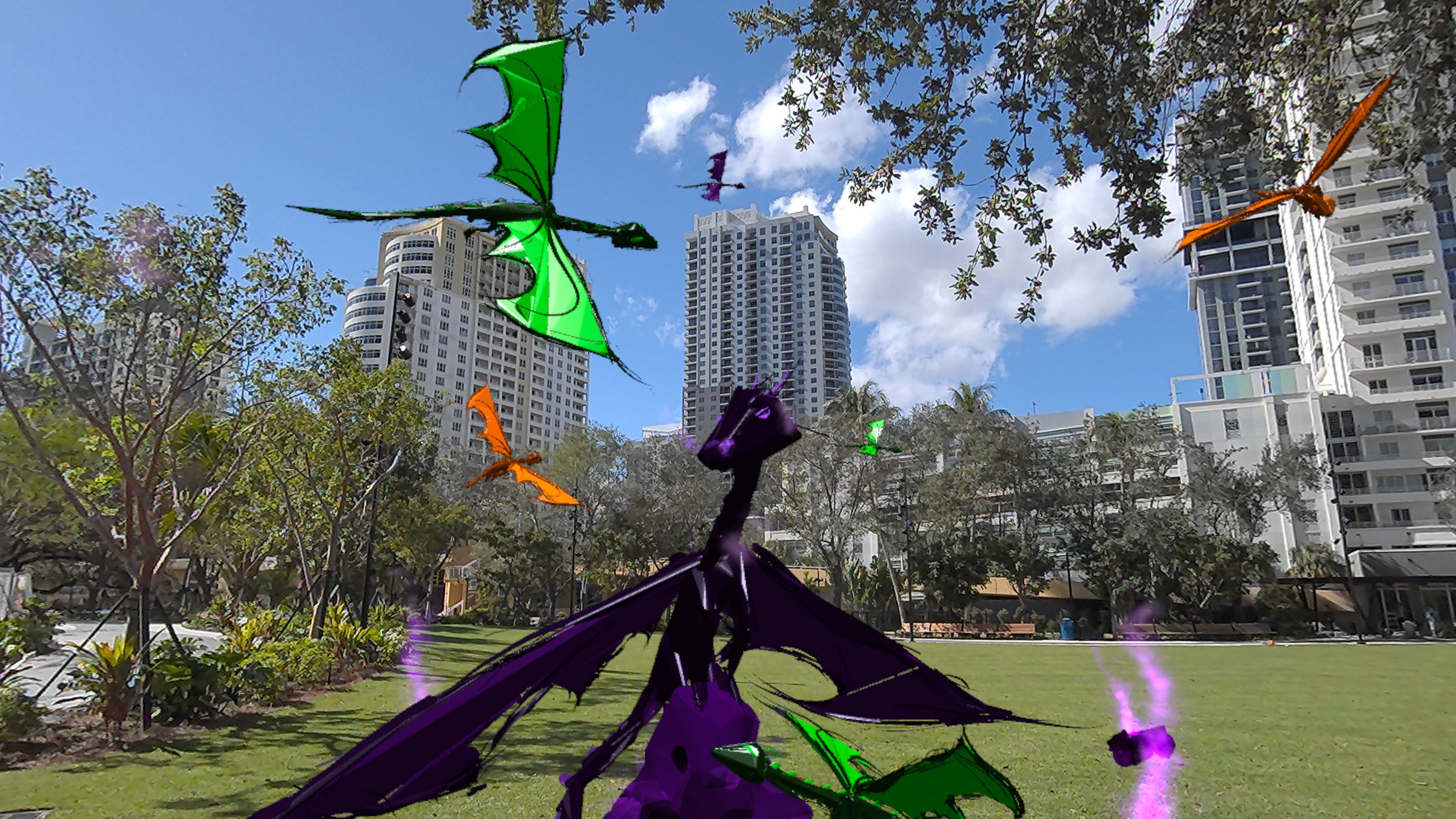 This project was designed specifically for Huizenga Park. My goal was to Transport visitors to a new world that is filled with dragons. This project has a main purple dragon upfront on a rock and others flying around the whole space.