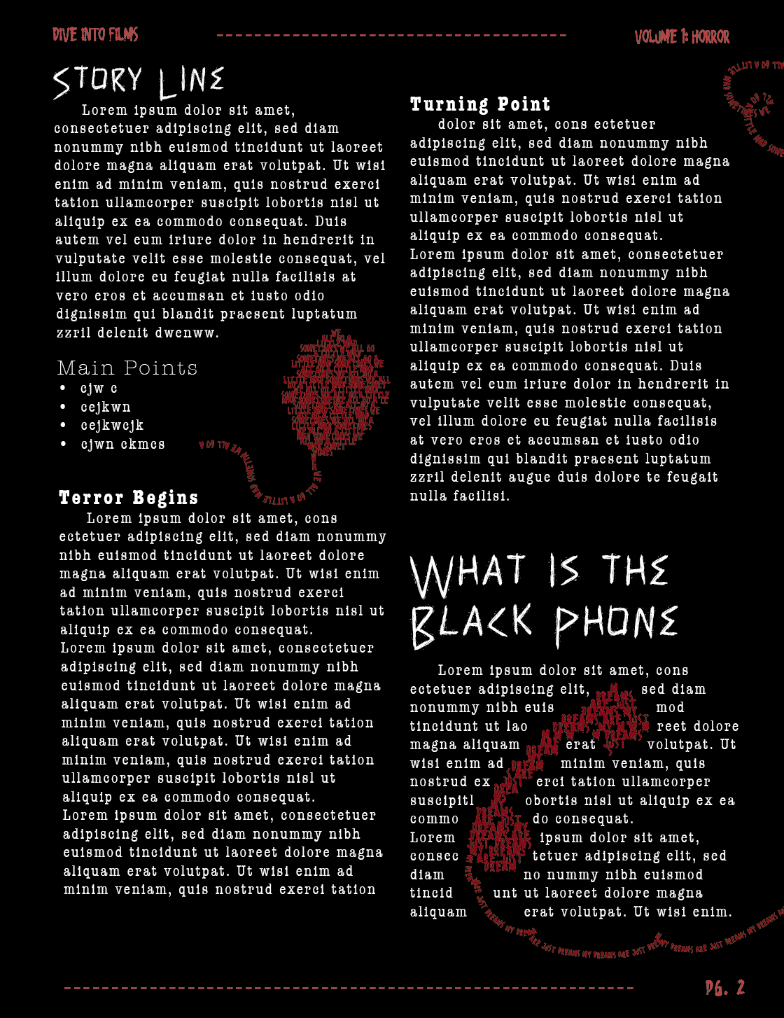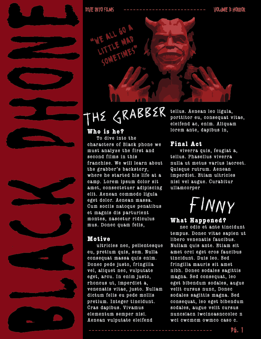 I created a page about the film black phone. I wanted to have a black, red and while color scheme to relate to the horror of the film. I used a typewriter font, and a creepy font for titles. To introduce the article, I did a sideways and larger black font so it stood out. I also created shaped type boxes to include quotes within iconic elements that are from the film.