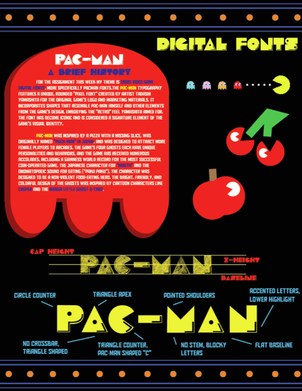 The goal of this assignment was to research digital styles of typography. I chose to look into the art style of the original pac-man video game.