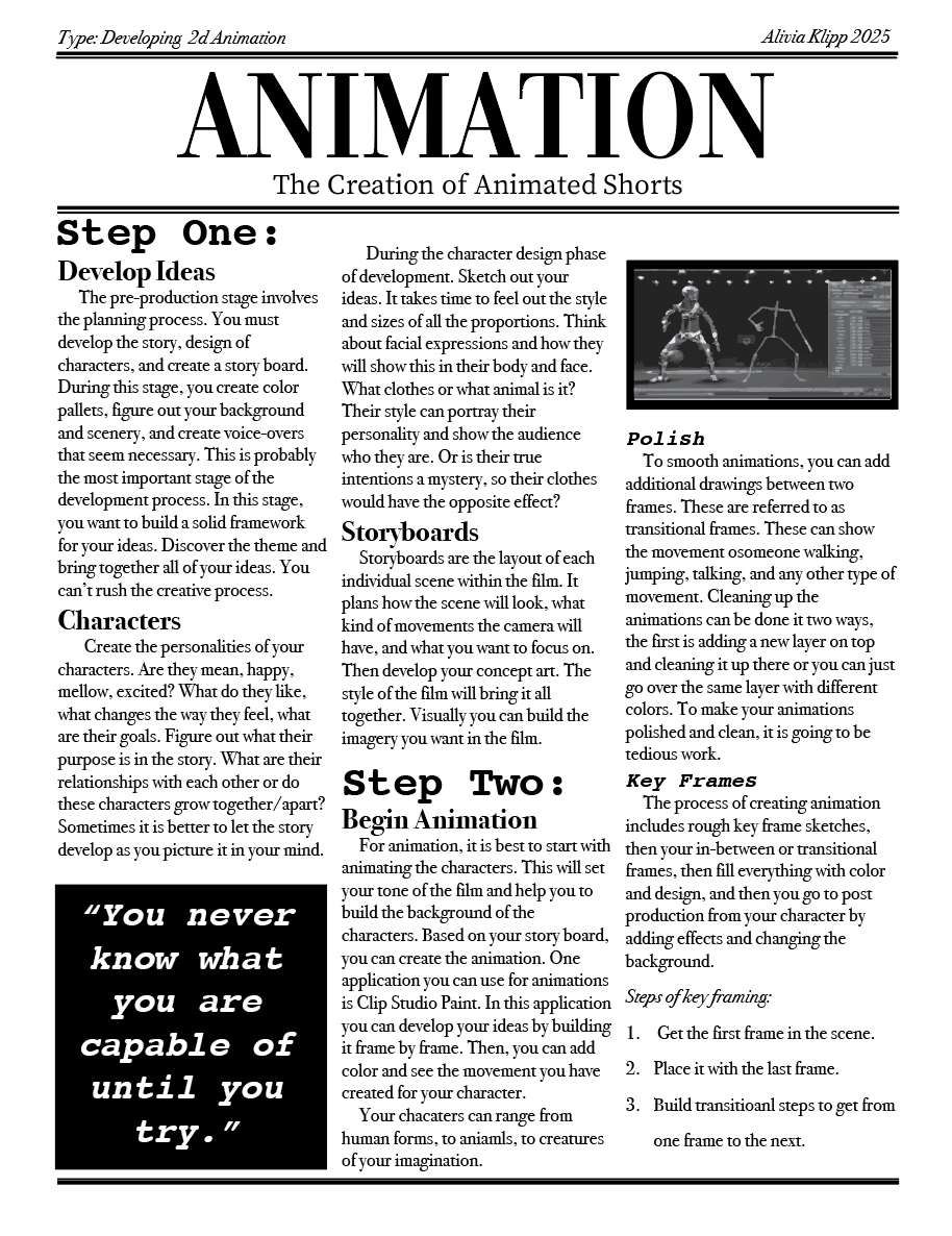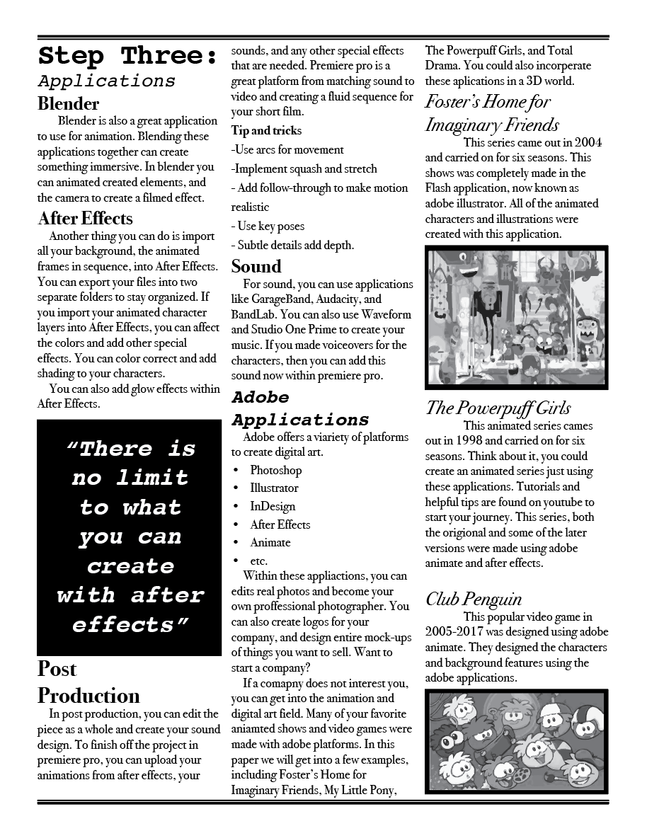 I created a page that is about the creation of animation. I organized the page to show the steps involved and included quotes and pictures that follow what the text is talking about.