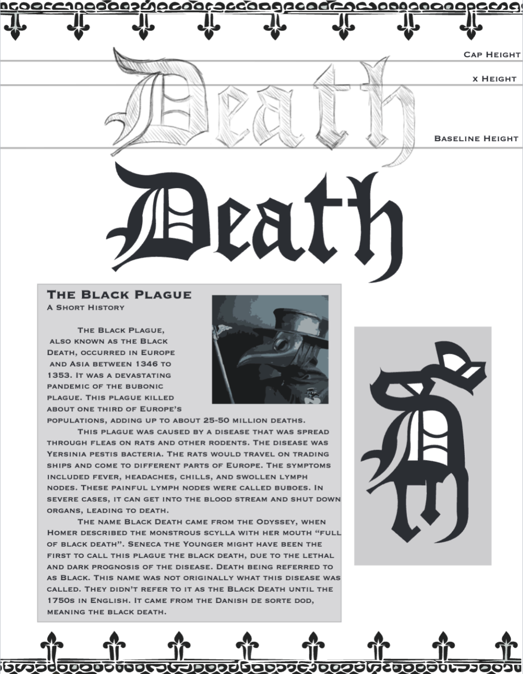 The goal for this assignment was to choose a font style that was used during the Roman Empire and the Renaissance era. I chose fonts resembling the BlackLetter fonts. For this assignment, I drew my own fonts, created a symbol using the letters, and researched my topic to connect it to my page design.