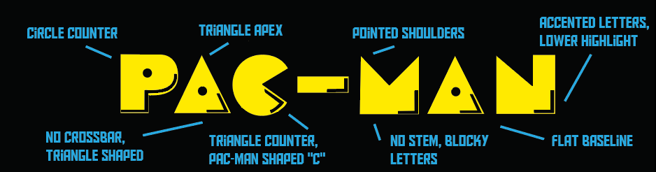 Pac-man uses very blocky and bold fonts that take up a lot of space. the letters also resemble the pac-man character in the game. They also used accent lines on the letters to make them more stylized and unique to the game.