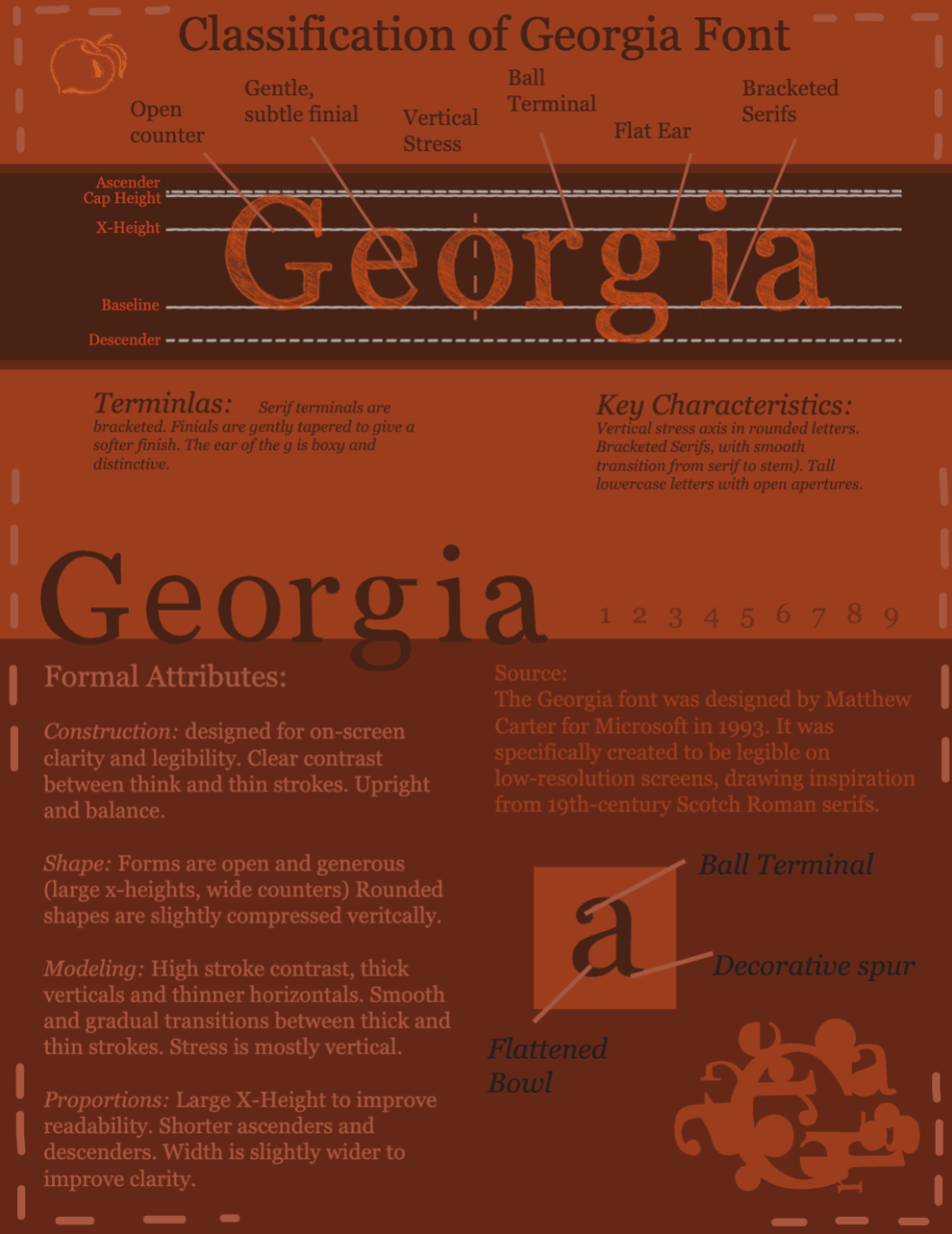 For the second page, I analyzed the Georgia font. I looked into the formal attributes, the key characteristics, and the source. For the design of the page, I wanted it to have neutral tones and keep a brown color scheme I made a structured and easy to follow page filled with information about the Georgia font.